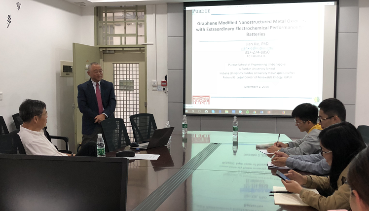 应厦门大学材料学院和福建省特种先进材料重点实验室邀请,2018年12月2日,美国普渡大学印第安纳波利斯分校Xie Jian教授莅临厦门大学材料学院,进行学术交流并商讨科研合作。12月2日上午在厦门大学科学楼404会议室,Xie Jian教授为师生们作了题为《Graphene Modified Nanostructured Metal Oxide Hybrids with Extraordinary Electrochemical Performance for Li-ion Batteries》的学术讲座,介绍了目前有关能源与环境前沿领域的最新研究进展,并就广大师生感兴趣的学术问题进行了广泛的交流和讨论。谢教授是新能源材料方面的知名专家、清华大学客座教授,长期从事燃料电池与锂离子电池等领域的研究,在动力电池、燃料电池等方面有很深造诣,拥有多项技术发明专利。Xie Jian教授还参观了实验室,并与重点实验室的相关研究人员进行了深入交谈,希望今后能与重实验室在纳米结构石墨烯应用于燃料电池和锂离子电池等方面开展广泛的学术交流,还就未来科研合作和学生交流等进行了洽谈。